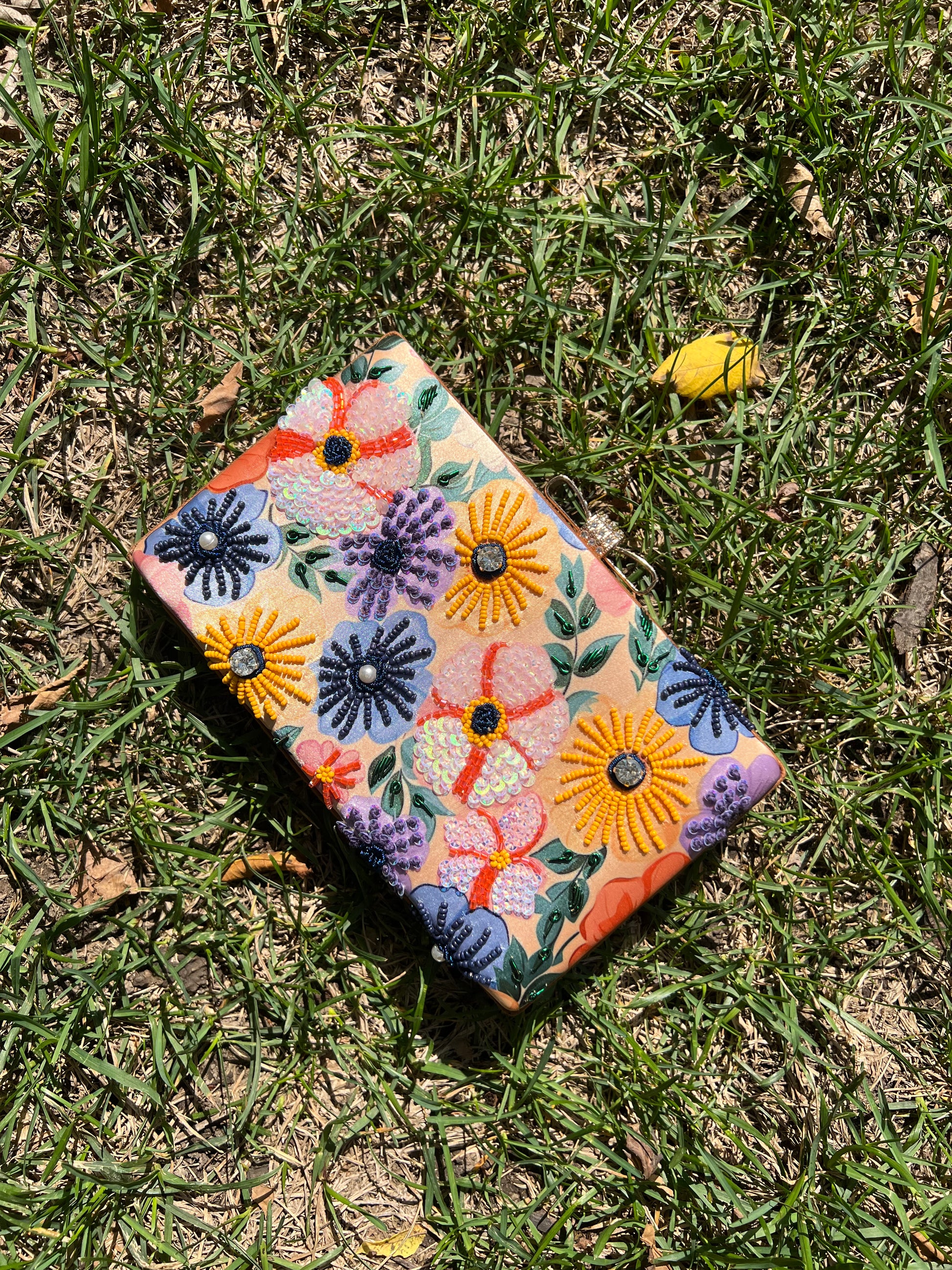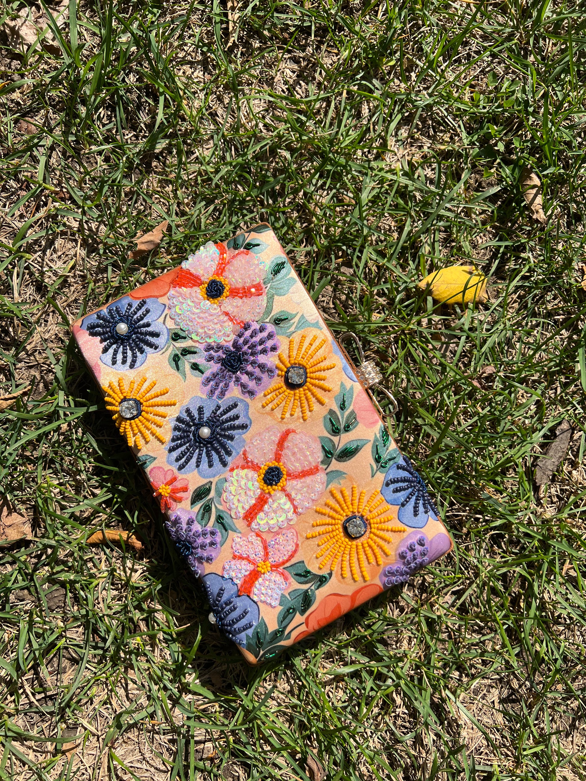 Handmade with Satin and Adorned with colourful floral Beadwork and Sequins, the Sunlit Meadow brings the beauty of a Blooming Garden to your look.